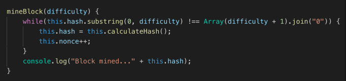 まず、mineBlock(){}でmineBlock()関数を定義し、引数にdifficultyを定義します。このdifficultyはマイニングにおける難易度を定義するための引数です。