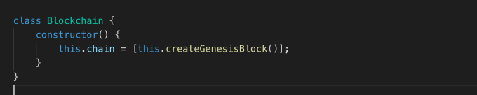 Blockchainクラスを定義します。そしてそのコンストラクタにチェーンオブジェクト(配列)を定義しましょう。ブロックチェーンではそれぞれのブロックが時系列順にどんどん配列にスタックされていきますが、最初のブロックのことを特別に「ジェネシスブロック(Genesis Block)」と言います。ジェネシスブロックはpreviousHashが「0000」として定義されている特別なブロックです。一番最初のブロックなので、コンストラクタ内のchain配列内に関数を通してジェネシスブロックを入れておきましょう。